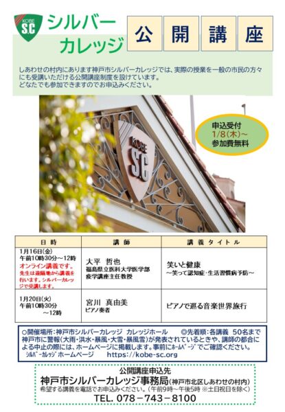 | 2026年 1月16日(金)午前10時30分~12時 ※先生の都合によりオンラインでの講義となりました。 先生は遠隔地から講義を行います。 | 大平 哲也 (福島県立医科大学医学部疫学講座主任教授) | 笑いと健康 ~笑って認知症・生活習慣病予防~ | 1月8日~ |